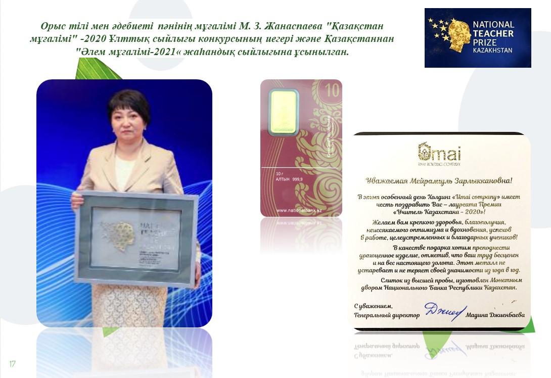 Именно влияние личности учителя, его социально значимая роль в различных аспектах жизни учеников лежат в основе оценивания конкурса Национальной премии «Учитель Казахстана» -2020. Учитель русского языка и литературы Жанаспаева М.З. стала лауреатом данной премии, награждена денежным призом и золотым слитком. Учитель номинирована от Казахстана на Глобальную премию «Учитель Мира -2021». Она представила на конкурс экологическую и волонтерскую деятельность как одно из направлений ее опыта работы в школе.