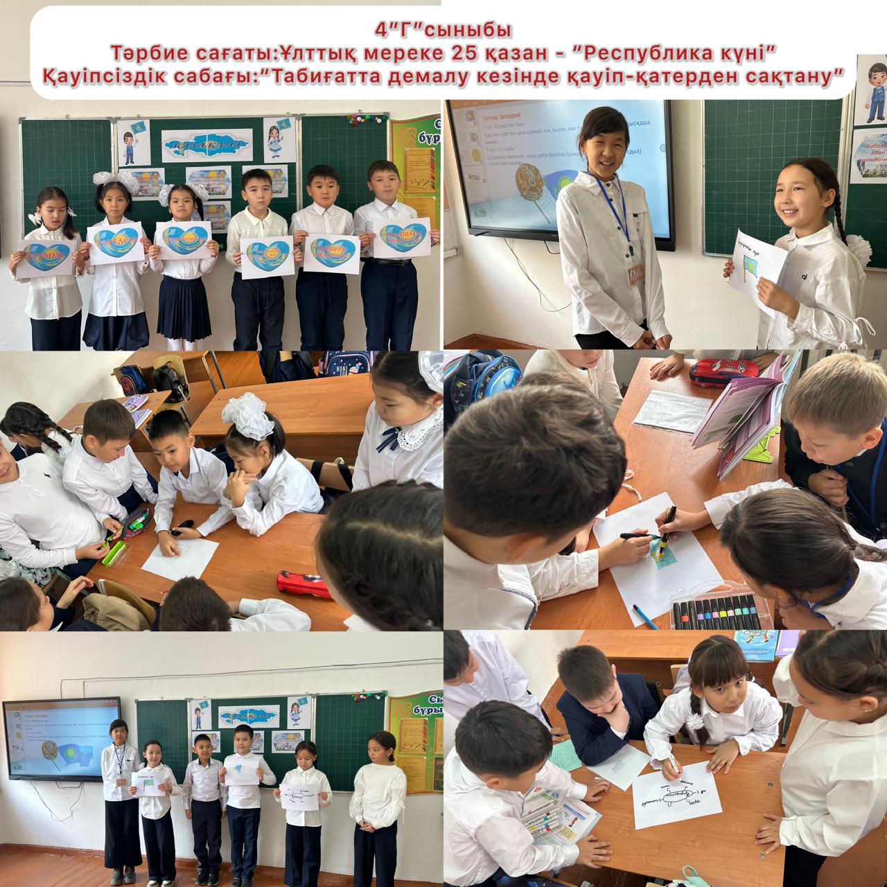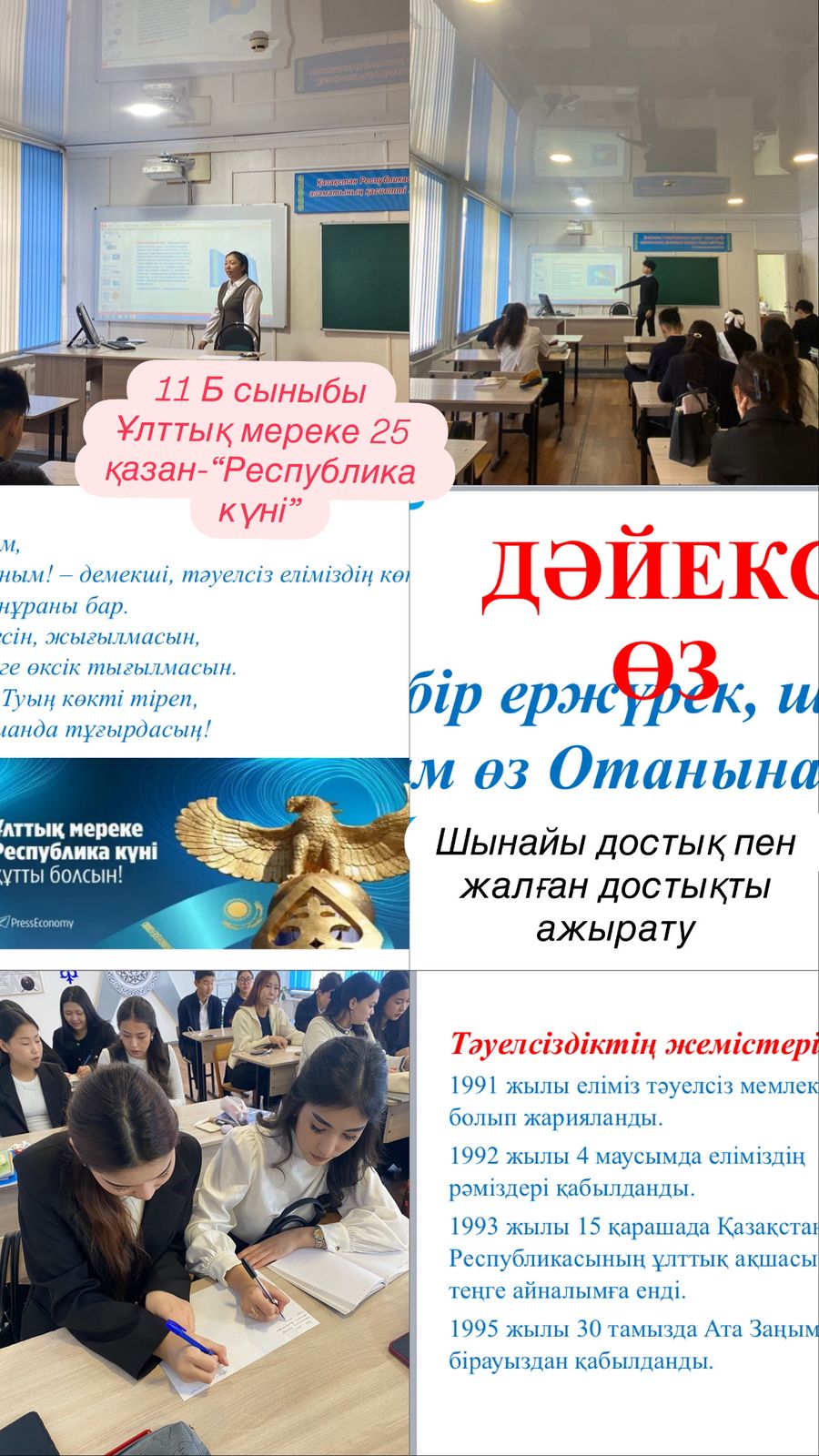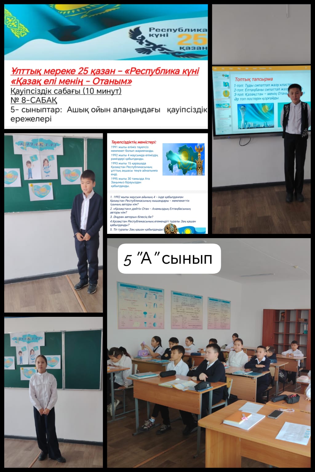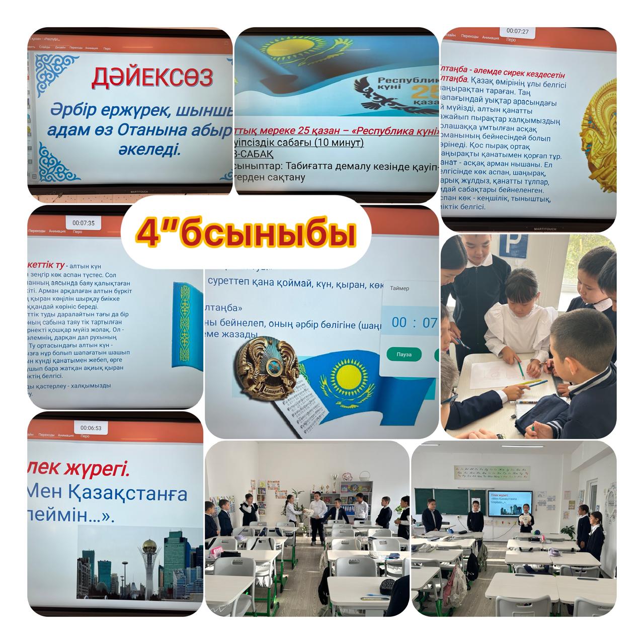 “ТӘУЕЛСІЗДІК ЖӘНЕ ОТАНШЫЛДЫҚ” айы жоспары аясында, 25 қазан - Республика күніне орай мектебімізде "Қазакстан - туған жерім, туған елім!" такырыбында 1-11 сыныптар аралығында бірыңғай сынып сағаттары өтті.
