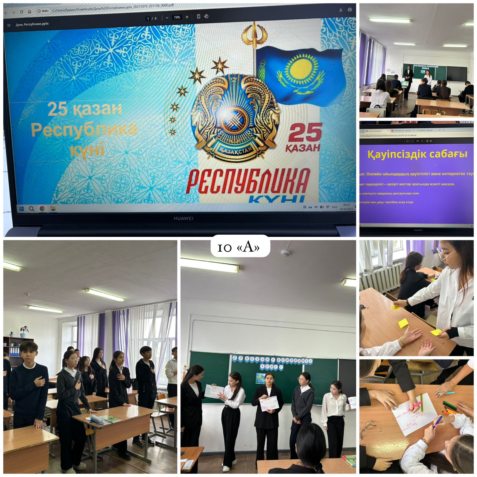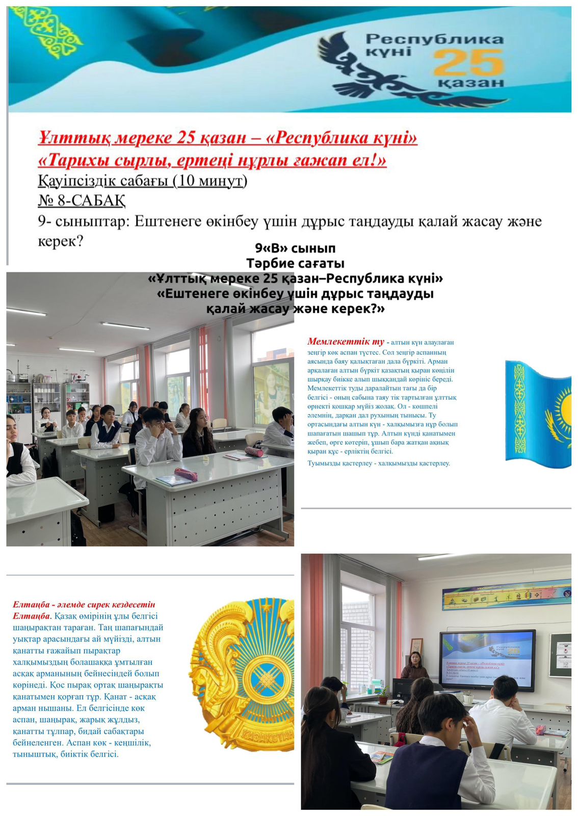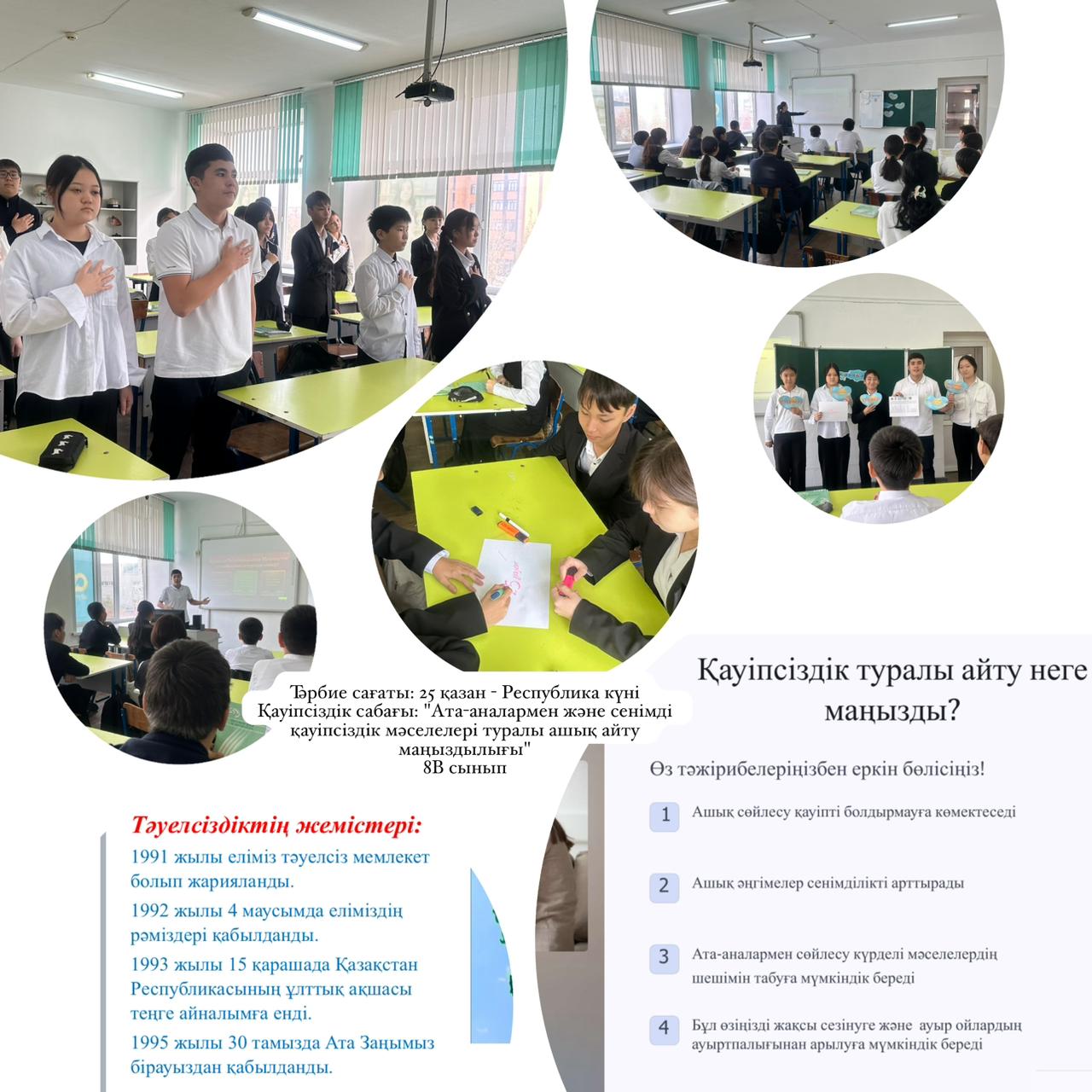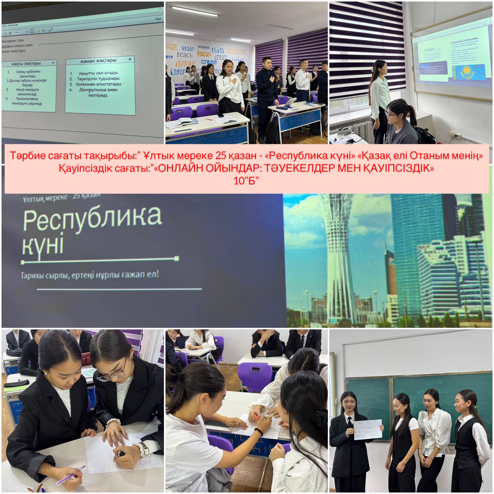 “ТӘУЕЛСІЗДІК ЖӘНЕ ОТАНШЫЛДЫҚ” айы жоспары аясында, 25 қазан - Республика күніне орай мектебімізде "Қазакстан - туған жерім, туған елім!" такырыбында 1-11 сыныптар аралығында бірыңғай сынып сағаттары өтті.