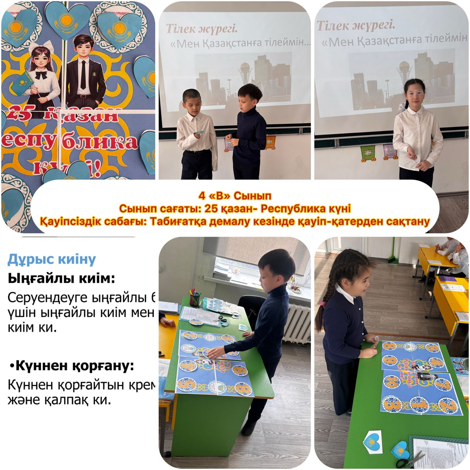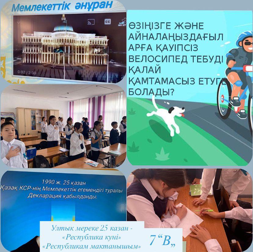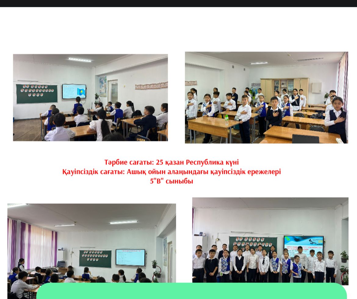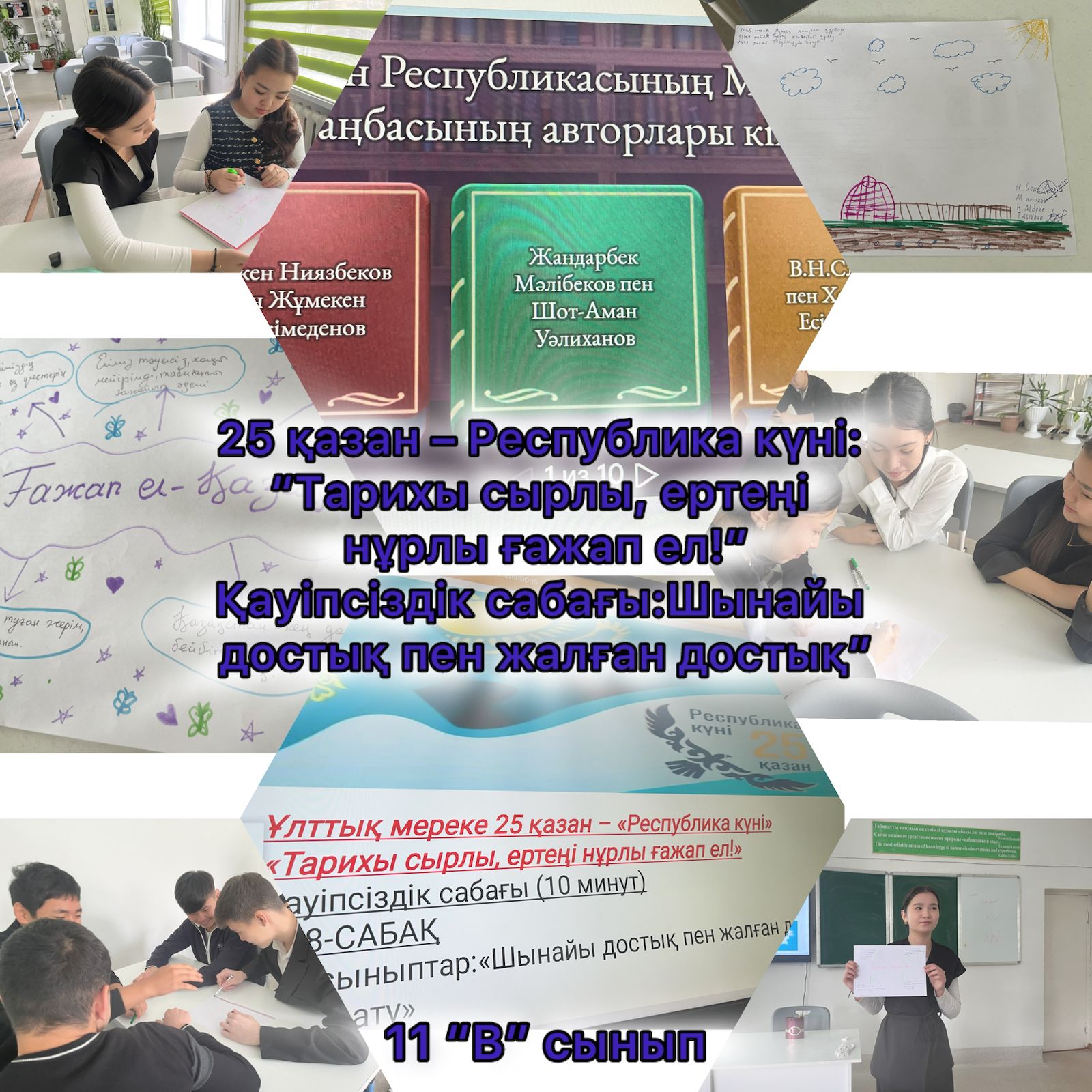 “ТӘУЕЛСІЗДІК ЖӘНЕ ОТАНШЫЛДЫҚ” айы жоспары аясында, 25 қазан - Республика күніне орай мектебімізде "Қазакстан - туған жерім, туған елім!" такырыбында 1-11 сыныптар аралығында бірыңғай сынып сағаттары өтті.