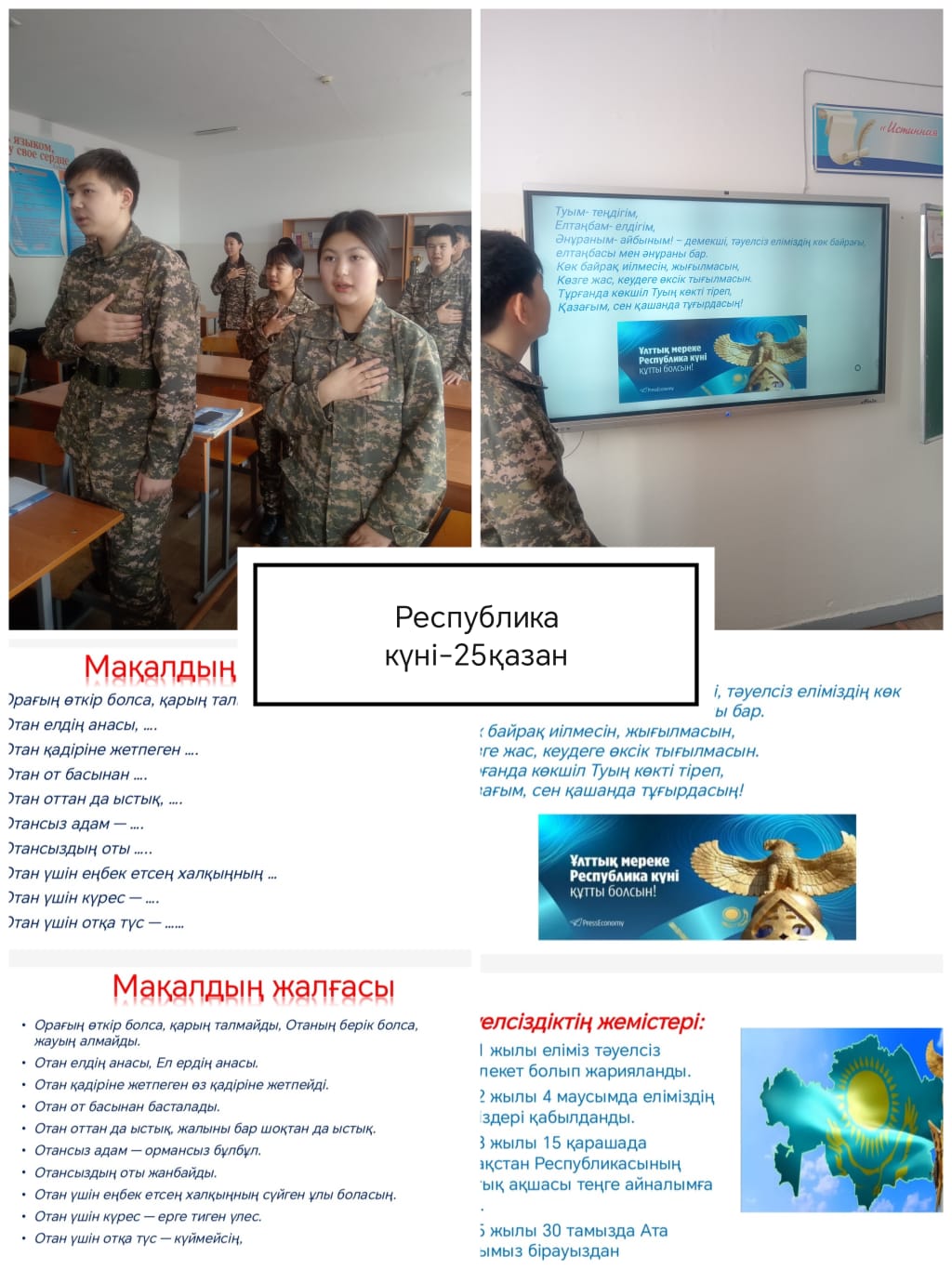 такырыбында 1-11 сыныптар аралығында бірыңғай сынып сағаттары өтті. Іс-шараның негізгі мақсаты - окушылардың отансүйгіштік сезімін қалыптастыру, туған жерге деген кұрмет пен мақтаныш сезімін арттыру болды.
