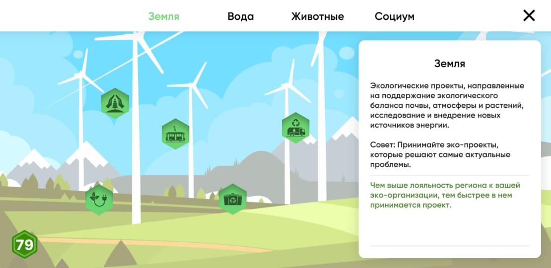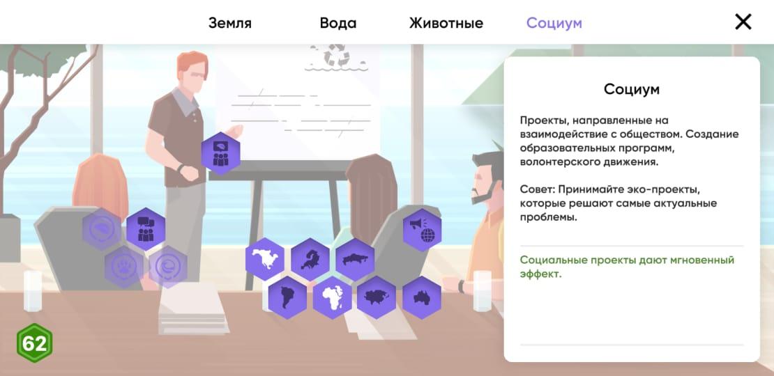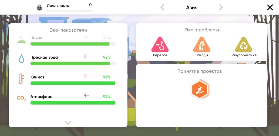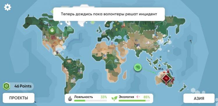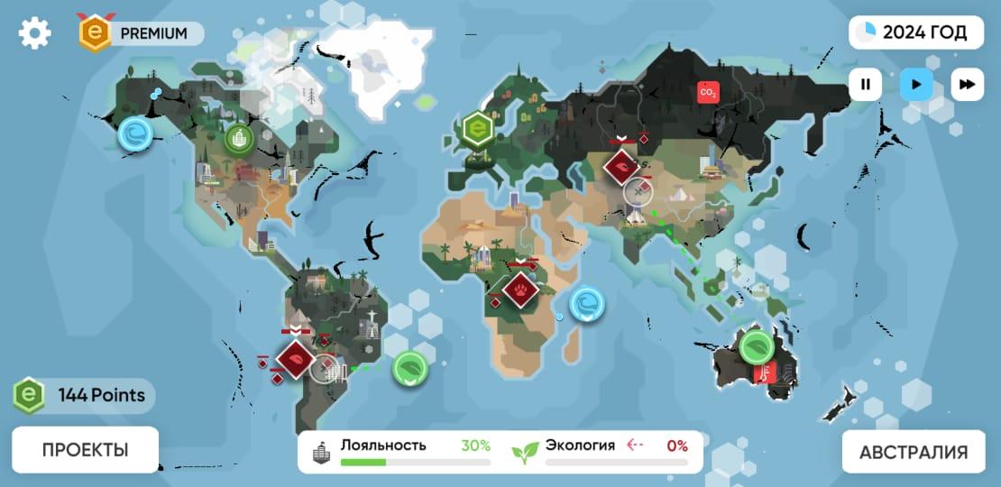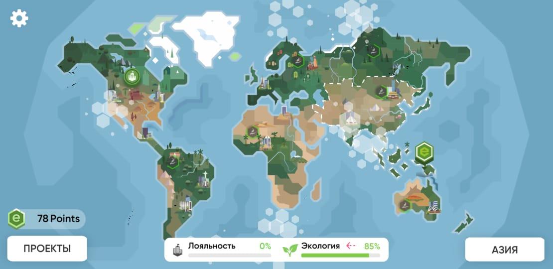 Спасти Планету Климатический Удар - первая образовательная игра про экологию с увлекательным стратегическим геймплеем. Узнайте в деталях о реальных экологических проблемах, причинах их появления и инициативах людей со всего мира по спасению планеты от экологической катастрофы. Вам предстоит взять на себя роль фонда по спасению планеты. Займитесь зелеными инициативами, которые повлияют на будущее Земли. Изучайте, думайте, делайте выбор и смотрите к чему это приведет. Как играть: Цель игрока заключается в том, чтобы на ранних этапах стабилизировать экологическую обстановку на всей планете. В дальнейшем шаг за шагом восстановить и улучшить эко-состояние земли. В конце игры вы получите статистику насколько успешной была ваша миссия. Каждый шаг приводит к разным последствиям, вам нужно действовать обдуманно и при этом - незамедлительно.Геймплей стратегической образовательной игры Спаси планету Климатический удар: