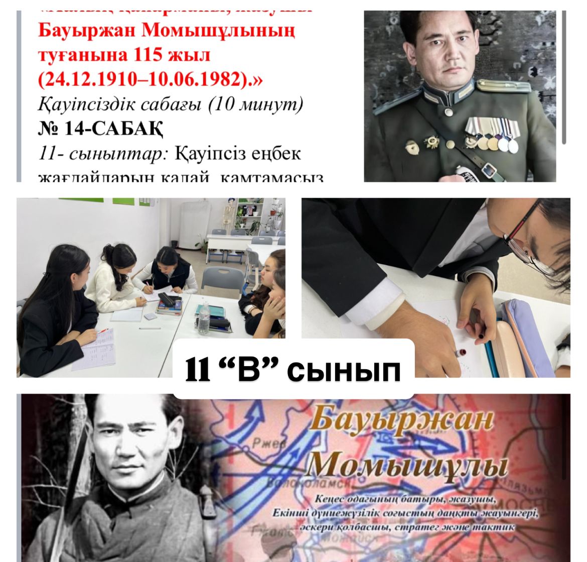 «Адал азамат» біртұтас тәрбие бағдарламасы аясында, желтоқсан айының жоспарына сәйкес, мектебімізде даңқты қолбасшы, Кеңес Одағының Батыры, қазақ халқының қайсар перзенті Бауыржан Момышұлының туғанына 115 жыл толуына орай 1–11 сынып оқушылары арасында мазмұнды тәрбие сағаттары және 10 минуттық қауіпсіздік сағаттары ұйымдастырылды. Бұл іс-шаралар жас ұрпақты ерлікке, батылдыққа, отансүйгіштікке баулуды мақсат етті.